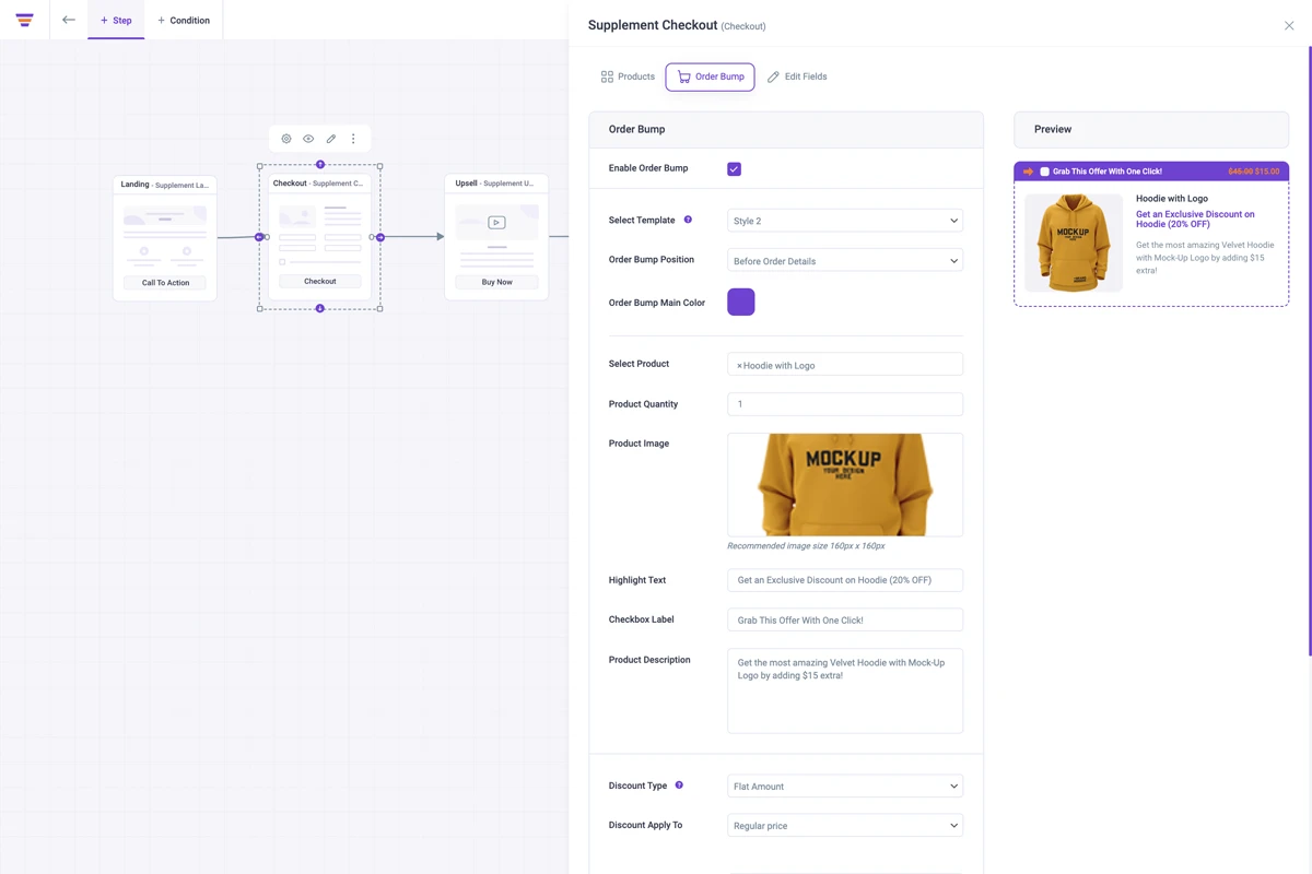 Dzięki WPFunnels możesz zmaksymalizować przychody za pomocą warunkowych kroków lejka, które dostarczają unikalne oferty zamówień każdemu klientowi. Wstawiaj zamówienia na swojej stronie kasy, zachęcając klientów do dodania ich do koszyka jednym kliknięciem. I twórz oferty up-sellingowe lub down-sellowe po kasie, aby zwiększyć swoje przychody dzięki dodatkowej sprzedaży produktów o wyższej wartości.